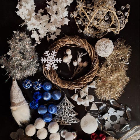 Vuosien varrella kertynyttä ja nyt käyttämättä jäänyttä joulutavaraa. Mukana on uutta ja vanhaa, valmista ja jouluisia askartelutarvikkeita. Osa tavaroista on tullut tiensä päähän ja pitäisi heittää pois, mutta toisen roska voi olla toisen aarre - helpompi, kun ostaja tekee perkaamisen. Esimerkkinä mainittakoon, että valkoisesta pikkulyhdystä on yksi lasiseinä rikki. Ja toisaalta mukana mm. noin 150 kpl hopeanväristä männynkäpyä ja monta avaamatonta adventtikalenteria, erilaisia joulukuusen palloja ja käpyjä, enkeleitä jne. jne. Kaikki tavarat ovat kansikuvassa yhdessä ja sen jälkeen muissa kuvissa jaoteltuina ryhmiin. Ja kaikki nämä täyttävät siis yhden banaanilaatikon.