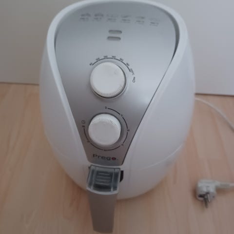 Philips Airfryer kuumailmapaistinu, valkoinen väri. Laite soveltuu ruoan paistamiseen kuumailmatekniikalla, mikä mahdollistaa vähärasvaisen ruoanvalmistuksen. Sisältää irrotettavan paistoastian ja säätönupin lämpötilan ja ajan hallintaan. Kuvassa näkyy ilmastointiteipillä korjattu kohta, ei ole vaikuttanut käyttöön.