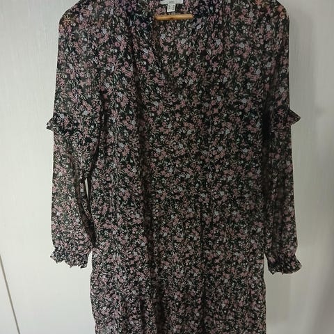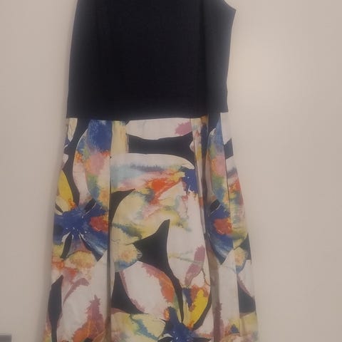 Espritin juhlamekko. Päällä sifonkimaista kangasta, jossa luonnonvalkoisia renkaita. Hihat läpinäkyvät, vähän puffimaiset. Leikkaus rintojen alla, jossa myös satiininauha. Nauhalla voi säätää kireyttä.