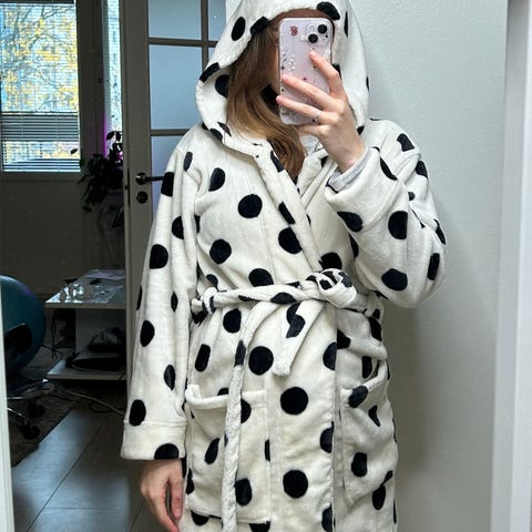 Kylpytakki koko S. Reilua kokoa, joten menee isompikokoisellekin. Ihanan pehmeää matskua, ei sellaista kovaa froteeta. Taloudessa ei tupakointia eikä hajusteita, pesty hajusteettomilla pesuaineilla.