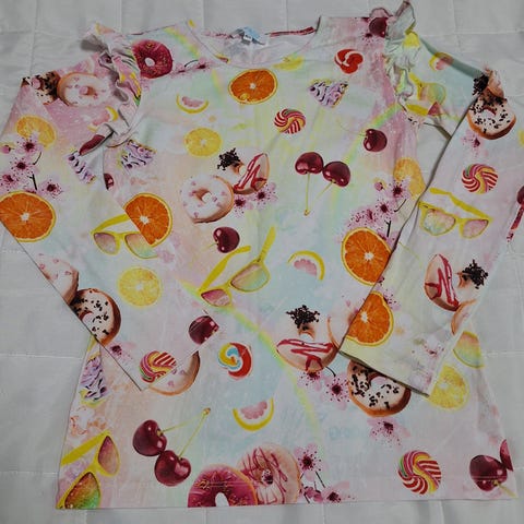 Uutta vastaavassa kunnossa oleva, käytetty, ehjä, nukaton ja tahraton Pop&Co -merkkinen toppi, jossa pienet frillahihat. Koko 152 cm. Materiaali 95% puuvilla, 5% elastaani. Pesty tuoksuttomalla pesuaineella. Savuton ja lemmikitön talous.