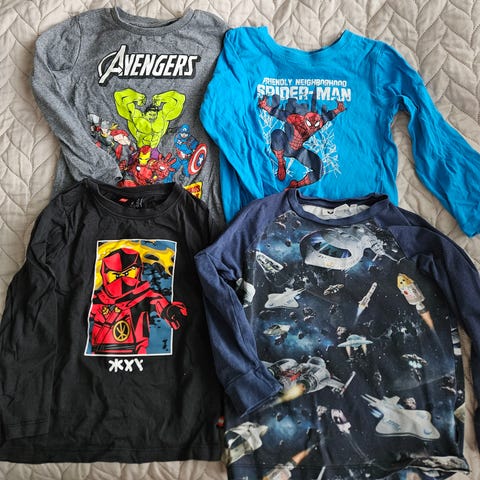 Myydään neljä paitaa. Kokolapussa variaatioita 104/130 mutta ovat aikalailla samankokoisia kuitenkin kaikki.