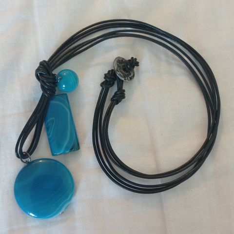 Turkoosi kaulakoru lasihelmistä. Donitsin halkaisija 4cm. Ympärysmitta n.60cm. Niskahelmellä pystyy säätämään lyhyemmäksi.