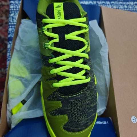 Babolat jet premura 2 padelkengät. Käytetyt, mutta vielä hyvässä kunnossa. Isovarpaan kohdalta laitettu pari ommelta estämään, ettei kengät rikkoudu siitä kohtaa. Kannassa kulumaa. Pohjissa vähän kulumaa, mutta hyvä grippi vielä kentällä. Kevyet ja tukevat kengät. Koko EU 43 / US 9.