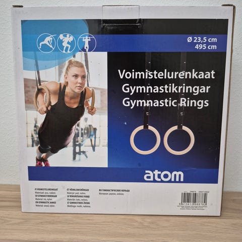 Setti sisältää kaksi puista voimistelurenkaita ja säädettävät mustat hihnat. Renkaat on valmistettu puusta ja hihnoissa on merkinnät pituuden säätöä varten. Sopii kuntoiluun ja voimisteluun.