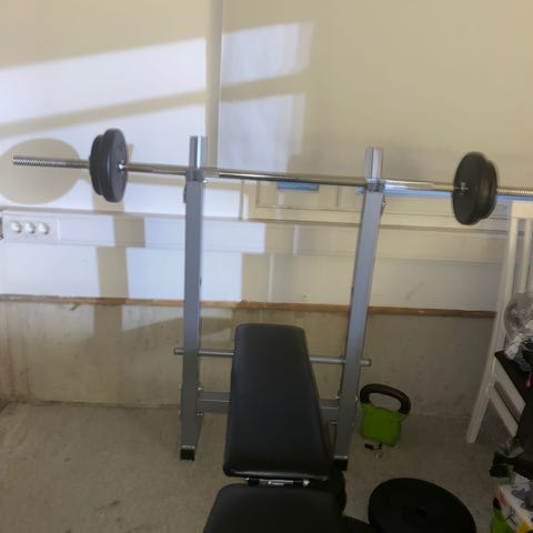 Käytönjälkeä löytyy, toinen 15kg levypainoista vuotaa hieman hiekkaa, mutta korjattu jesarilla, hyvin nostelee silti. Muuten täysin kunnossa oleva setti.