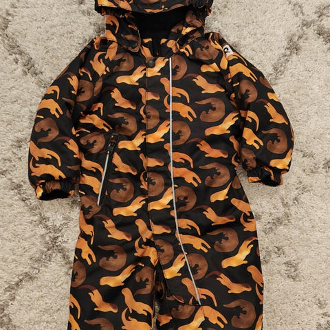 Reiman Lappi toppahaalari kokoa 80. Oikeassa polvessa yksi isompi naarmu, joka on paikattu mustalla vaatelaastarilla, muuten polvissa ei isompia naarmuja. Pepussa vain pieniä naarmuja pinnassa.