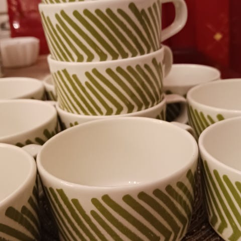 Marimekko Silkkikuikka (for Finnair) kahvikupit, 4 kappaletta, valkoinen pohjaväri ja vihreä kuvio.