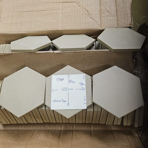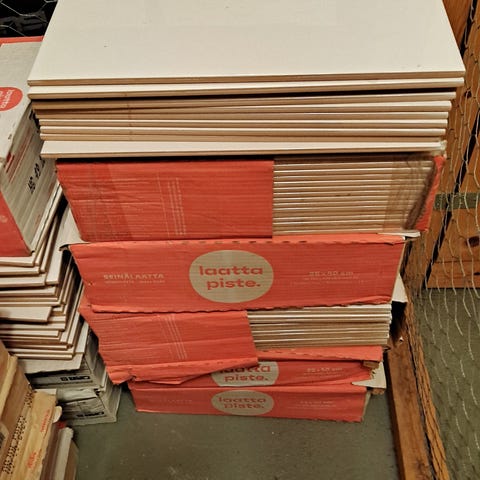 Harmaa laatta. Tuote sopii esimerkiksi lattia- tai seinäpinnoille sisä- tai ulkokäyttöön käyttökohteesta ja laatan ominaisuuksista riippuen. Pakattu useisiin laatikoihin kuormalavalle. Määrä n. 14 m2.