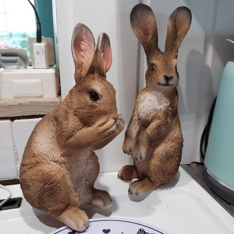 Kuvien pupu patsaat. Polyresiiniä, jotain muovin tapaista.Ollut koristeena hyllynpäällä. Joten kunto uudenveroinen.