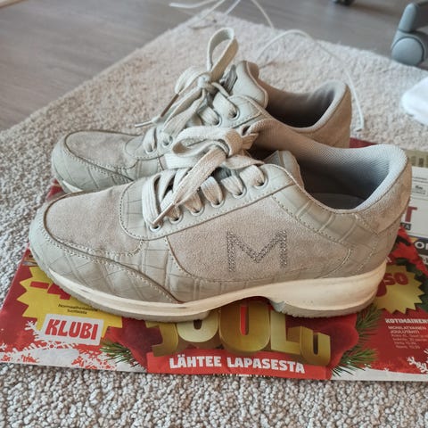 Mustat siistikuntoiset tennarit. Pölyiset säilytyksestä ja joitakin tahroja. Pohja on edelleen joustava.
