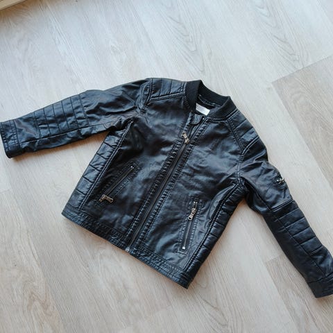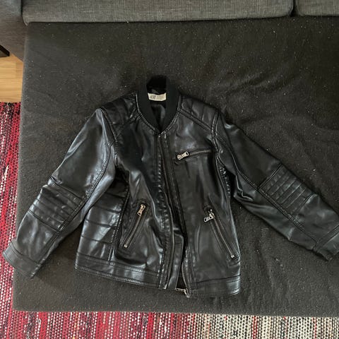Erinomaisessa kunnossa oleva karvavuorella ja hupulla varustettu tekonahkatakki, koko 116.