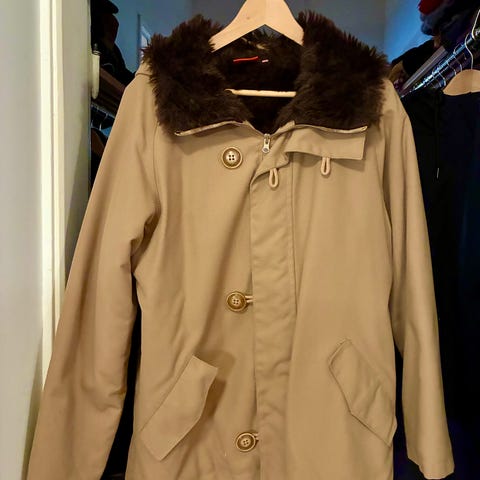 Keltainen Makian talvitakki tekoturkisvuorella, koko M. Siistissä kunnossa: ulkopuolelta kuin uusi, vuori helmasta vähän tummentunut ja muutamasta kohtaa nyppyyntynyt.