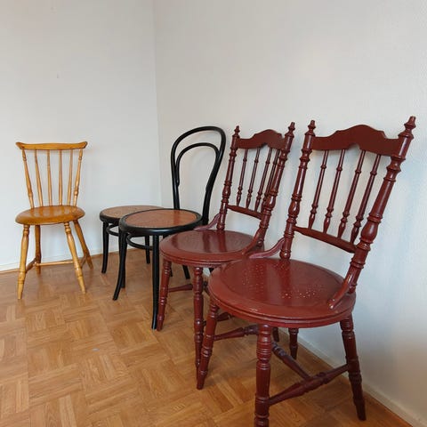 Vanha puinen keinutuoli, maalattu joskus uudelleen.Tuolissa näkyy käytön jälkiä ja maalipinnan kulumaa, mutta täysin ehkä.