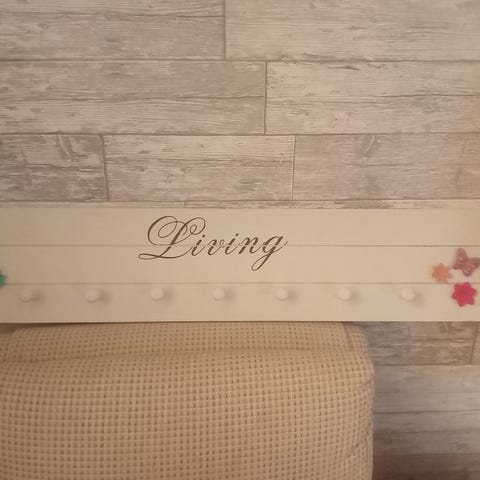 Pieni mettallinen naulakko. Puunupit antavat kivan lisäilmeen naulakolle. Leveys 20 cm korkeus 12 cm. Kahdella ruuvilla kiinnitys helposti seinään. Ruuvireikien väli 10,5 cm.