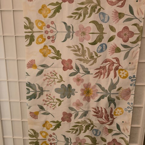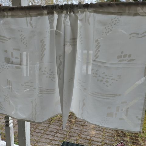 Noble Home valkoinen kappaverho, maksimipituus 250cm, mutta rypytettynä ollut vähän yli metrin levyisen ikkunan edessä. Mahdollisuus ripustaa tankoon (ks. kuva).