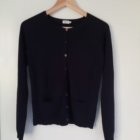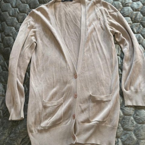Filippa K Neuletakki harmaa, naisten koko M. Valmistettu merinovillasta. Neuletakissa on pyöreä pääntie, nappikiinnitys edessä ja kaksi etutaskua. Muuten uudenveroinen, mutta vasemmassa olkavarressa pari purkaumaa (näppärämpi ihminen varmaan korjaisi vielä ihan siistiksi).
