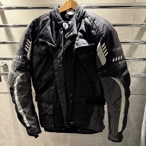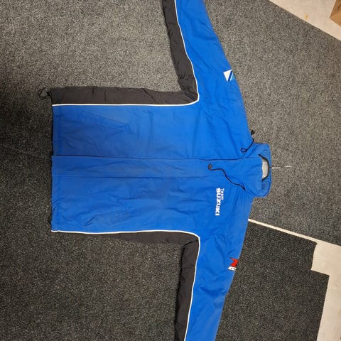 Retro Suzuki takki, koko M, valmistettu 100% polyamidista (nylon). Takissa on sininen ja monivärinen kuviointi, mukana ruutukuvioita. Takki on valmistettu Italiassa. Vetoketjut toimii. Hihat saa irroitettua.