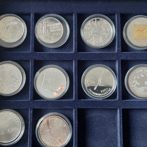 Täydellinen mitalikokoelma alkuperäislaatikossa, mitalit läpinäkyvissä muovikoteloissa. Mukana todistus. Yhden kolikon paino noin 26 g eli yhteispaino 936g.