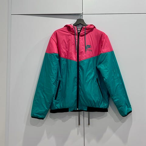 Toisella puolella tuulitakki Nylon materiaalinen, jossa edessä isolla Nike Logo. Logossa kulumaa joka tuo itsessään siistin lookin.