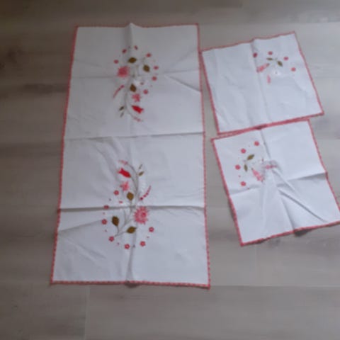 Kaunis reikäkirjottu(?) pieni liina. Pohjaväri valkoinen ja siinä kauniita kukkia.