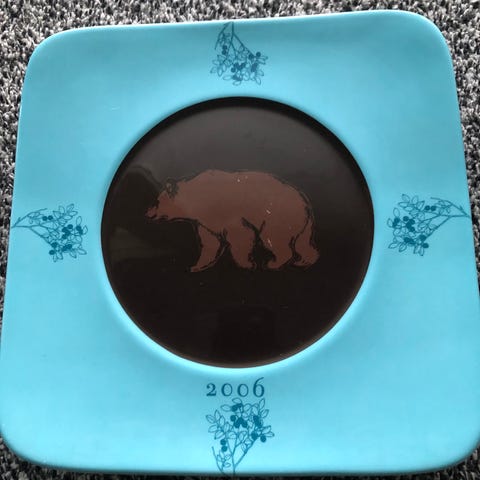 Arabia Flora & Fauna taulu lautanen, vuodelta 2007. Lautanen on neliön muotoinen, väriltään keltainen ja sininen, ja siinä on linnan kuva. Lautanen on suunniteltu Eero Siivola & Pekka Toivanen. Materiaali posliinia.