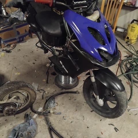 Etukatteet, 50cc pytty, paljon karsittu sähkösarja, läppiä, jarrulevyjä, etujarruletku, dominon pikakaasu, hihnoja, rullia, varikoppa jne...