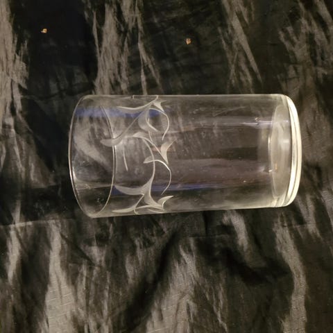 6 kpl väkeväviinilasi, jossa hiottu lehti-rypäleterttu-kuvio, korkeus 9 cm, suuaukko6,5 cm, hinta yhteensä, nouto käteisellä, Joensuu-Ylämylly