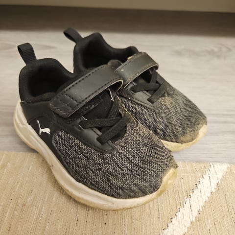 Myydään kuvan Puma lasten tennarit, koko 23. Kengät ovat harmaata kangasmateriaalia ja niissä on tarrakiinnitys sekä nauhat. Pohja on valkoinen kumia. Käytetty yksi kesä, joten jonkin verran kulumaa näkyvissä mm. pohjat värjääntyneet maasta ja päällinen hieman muotoontunut osasta kohtaa.