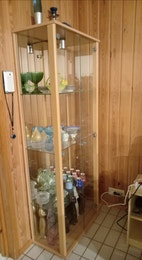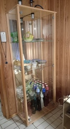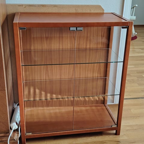 Tyylikäs lasivitriini lasihyllyillä ja valolla. Hyväkuntoinen ja siisti.