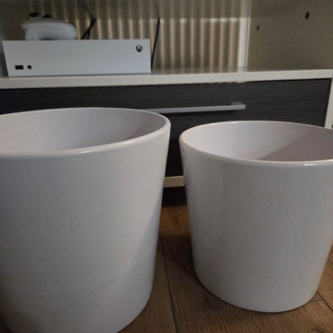 Käyttämätön, tarpeettomaksi käynyt keraaminen musta ruukku. Korkeus 26 cm, halkaisija 27,6 cm.