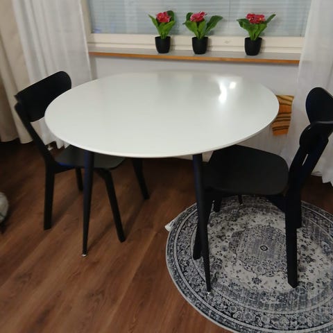Myydään ruokapöytä ja 6 tuolia. Pöytään kuuluu jatko pala. Leveys jatkopalan kanssa 147cm