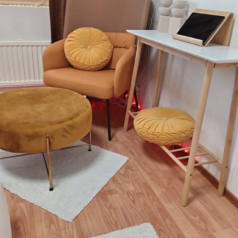 Roosan värinen nojatuoli jossa puiset käsinojat ja jalat. Käsinojissa hieman kulumaa. Tuolin kangas pehmeää sametin tapaista, helppo kostealla rätillä ottaa tahra pois. Irrotettava niskatyyny, takana tarranauha.