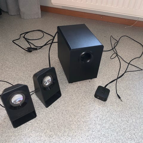 Pitkään varastossa olleet, toimivina poistetut Logitech tietokonekaiuttimet, 3-osainen sarja.