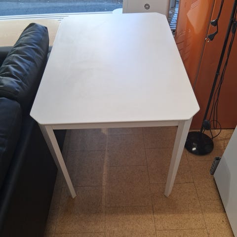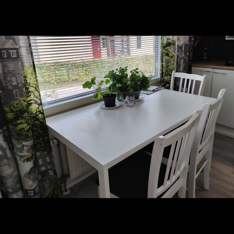 IKEA Valkoinen Näsinge-keittiönpöytä ja 4 tuolia. (ei istuintyynyjä). 73cm korkeus. 120cm pituus, 85cm leveys.