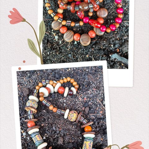 Boheemi käyttämätön korusetti. Sisältää yhden rannekorun/kaulakorun ja yhden yksittäisen korvakorun. Rannekorun/kaulakorun pituus on 59 cm. Korvakorun pituus on n. 20 cm ilman koukkua. Koukku saattaa sisältää nikkeliä.