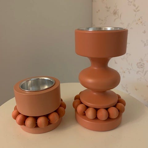 Myydään settinä kaksi Aarikan puista kynttilänjalkaa. Mallin nimi Prinssi. Harvinaisempi, upean syvänvioletti väri, sopii vaikka Halloween-juhliin. Helmikoristeen voi irrottaa ja käyttää rannekoruna. Toisen helmikoristeen kuminauha hieman löystynyt, muuten moitteeton kunto molemmissa!