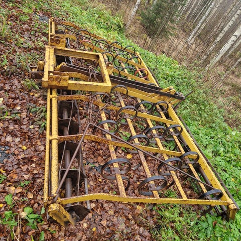 Varattu! Metallinen äes jousipiikeillä. Soveltuu pellon muokkaukseen ja maan tasaamiseen traktorin perässä vedettäväksi. Runkorakenne on terästä ja piikit on kiinnitetty jousilla, jotka auttavat maan pinnan rikkomisessa ja tasaisessa muokkauksessa.
