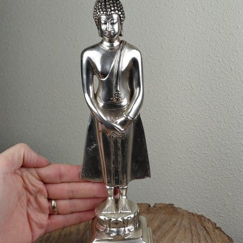 Tämä elegantti kuva esittää seisovaa Buddhaa Abhaya-mudrassa – klassista rohkeuden ja suojelun elettä. Se on peräisin Thaimaasta ja valettu pronssiin, ja kappale säteilee viileää, kirkasta valoa, joka korostaa rauhallista asentoa kauniisti. Oikea käsi on kohotettu ja avoin: hiljainen, ajaton "älä pelkää"-ele. Vasen käsi roikkuu rentona vartalon vieressä ja symboloi lempeyttä ja myötätuntoa.