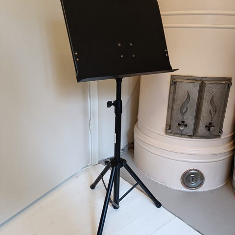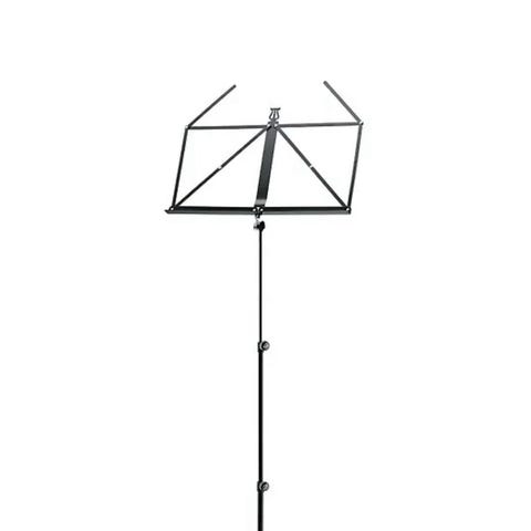Metallinen musiikkiteline, jossa säädettävä korkeus ja taittuva rakenne. Sopii nuoteille ja muille kevyille esineille. Musta väri, kevyt ja helposti kannettava malli.