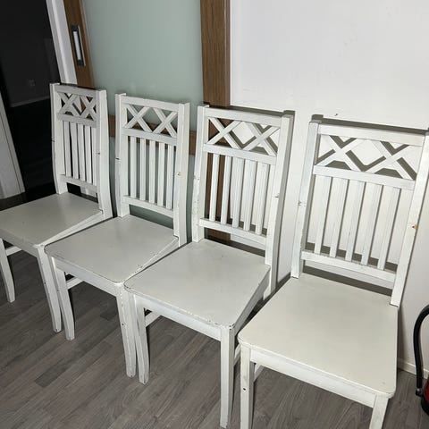 Kolme valkoiseksi maalattua tuolia, hyväkuntoiset ja tukevat. Olleet nyt tallinvintillä syksyn, eli kannattaa hitaasti kuivattaa. Hinta yhteensä.