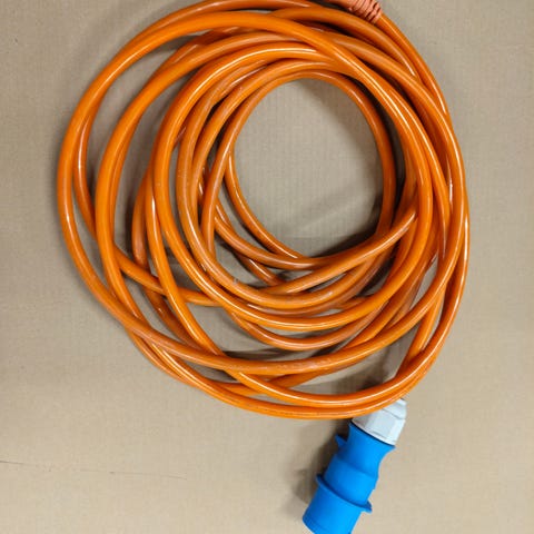 Sähkö kaapelilla Carbest, 25 metriä, kumikaapeli 3G 2,5 neliömilliä. CEE- liitäntäpistokkeet, uros ja naaras päät, lämpösuojakytkin