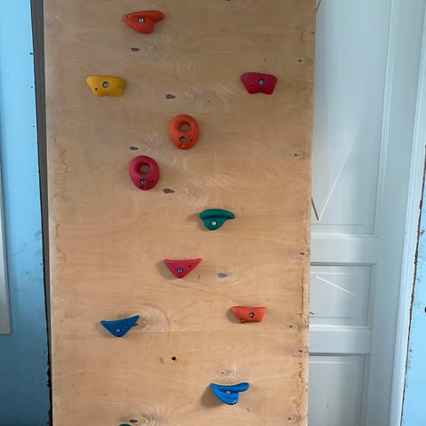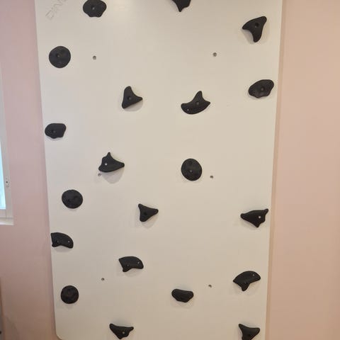 Kuvien mukainen tukeva ja turvallinen kiipeilyseinä, ensimmäiseltä omistajalta. Kestää hyvin myös aikuisen painon. Laadukkaat EP-otteet, jotka kiinnitetty ohjeiden mukaan lyöntimuttereilla ja M10 pulteilla. Otteita 60kpl. Seinä koostuu kahdesta levystä, jossa yhden mitat on 250cmx120cm. Levyn paksuus 2cm. Otteet ovat pääsääntöisesti helppoja ja niitä voi poistaa /siirtää vaikeustason muuttamiseksi. Tästä tulevalle kiipeilijälle erinomainen harjoitus seinä, jota voi tulla koekiipeämään. Levyt voi kääntää ja ovat toiselta puolelta alkuperäisellä puu pinnalla, jonka voi maalata mieleisekseen. 460€ / tarjous.