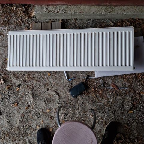 Valkoinen paneelipatteri lämmityselementti, valmistettu metallista, sopii sisäkäyttöön. Patteri on varustettu liitäntäputkilla ja ilmanpoistimella. Patterin pinnassa näkyy käytön jälkiä ja pieniä naarmuja.