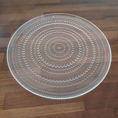 Kaunis tarjoilulautanen, jonka reunassa koristeellinen sydänkuviointi. Kustavi käsintehty mustikka. Halkaisija 27 cm.