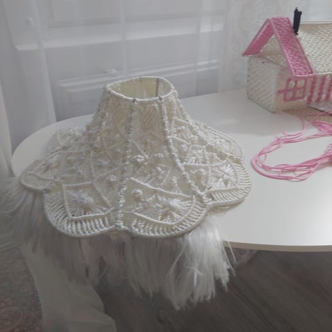 Hieno makrame pitsinen lampunvarjostin. Käsityö. Korkeus 10 cm, läpimitta 5,5 ja 10cm.