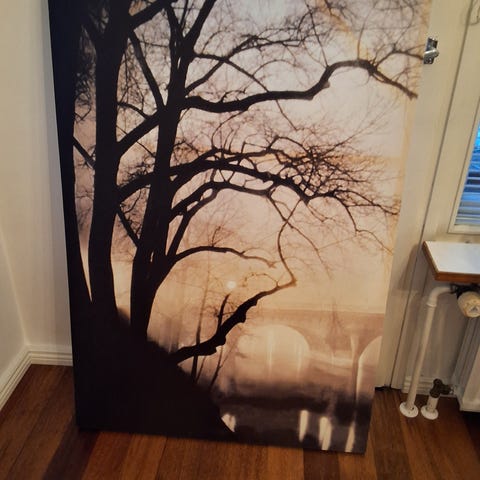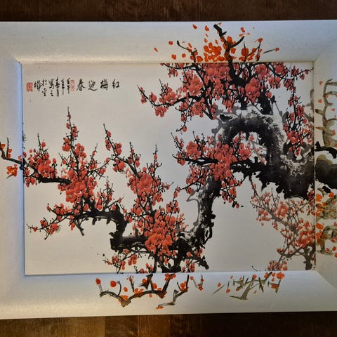 Hiekkatyönä käsintehty. Kiinnitetty polttamalla. Pohjaväri laatassa koboltinsininen. Koko 32 x 32 cm. Hopeanväriset kehykset. Hiekka vaaleanruskeaa