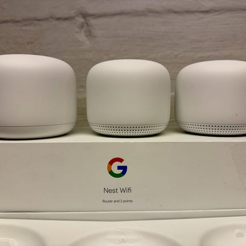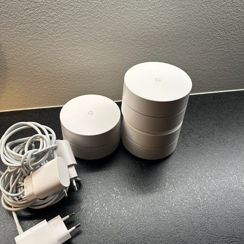 Google Nest Wifi reititin. Löytyy yhteensä 3 valkoista laitetta. Laiteet on suunniteltu kotiverkon laajentamiseen ja vakaan langattoman yhteyden tarjoamiseen. Väri valkoinen, muotoilu pyöreä, helppo sijoittaa eri tiloihin verkon kattavuuden parantamiseksi.