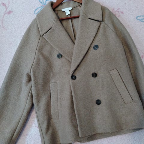 Myydään klassisen tyylikäs norsunluun värinen villakangastakki koossa 38. Takissa nepparikiinnitys. Siisti ja nukkaamaton (pl. kaksi todella pientä tahraa hihassa, kts. viimeinen kuva).