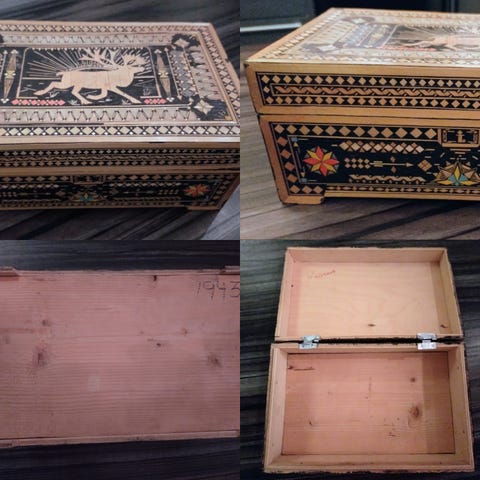 Sota muisto sydän rasia vuodelta 1944, pinta kulumaa jonkin verran. Koko 12 x 8,5 cm, kork. 5 cm. Nouto tai postitus 8,90€